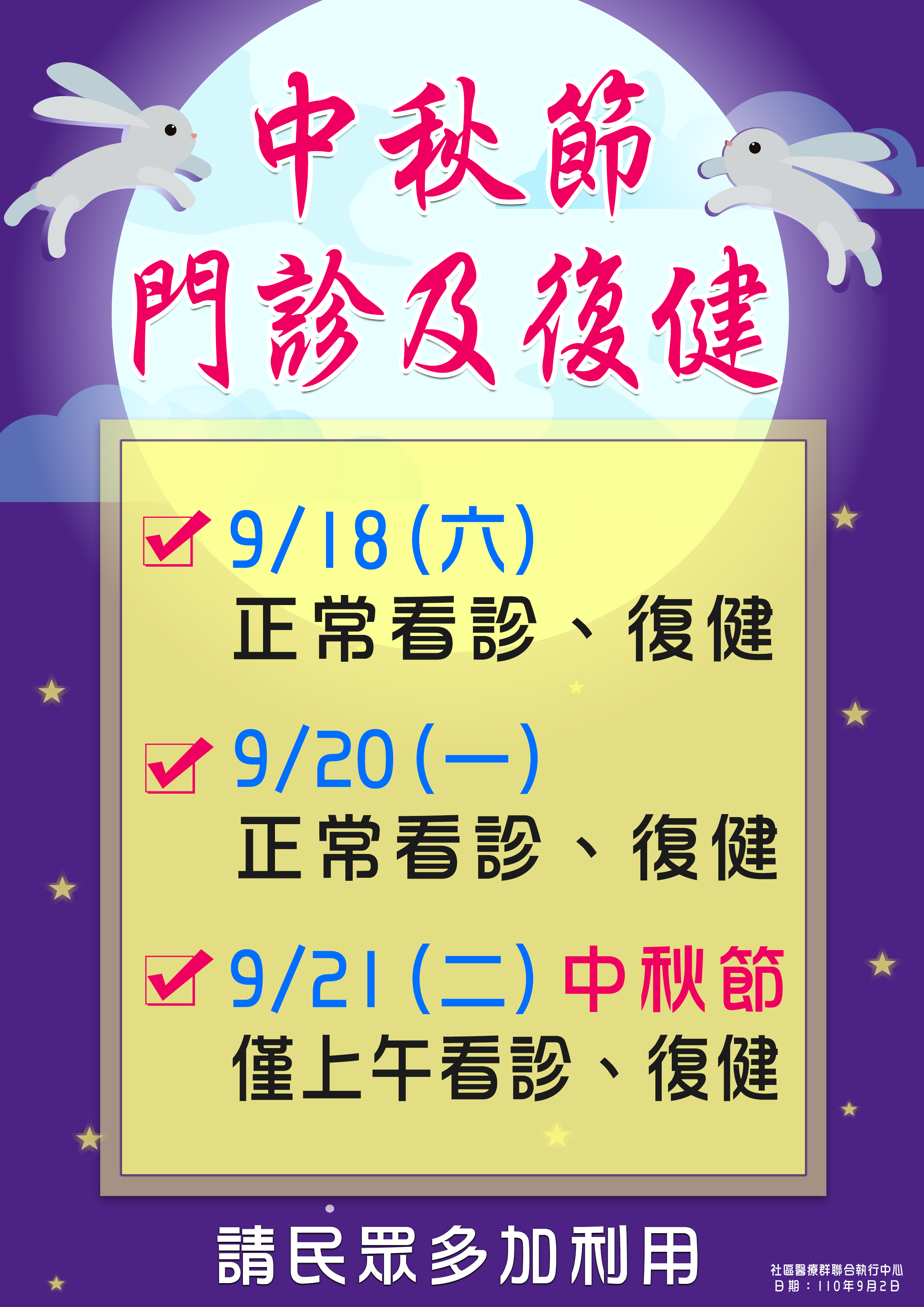 中秋節門診及複建